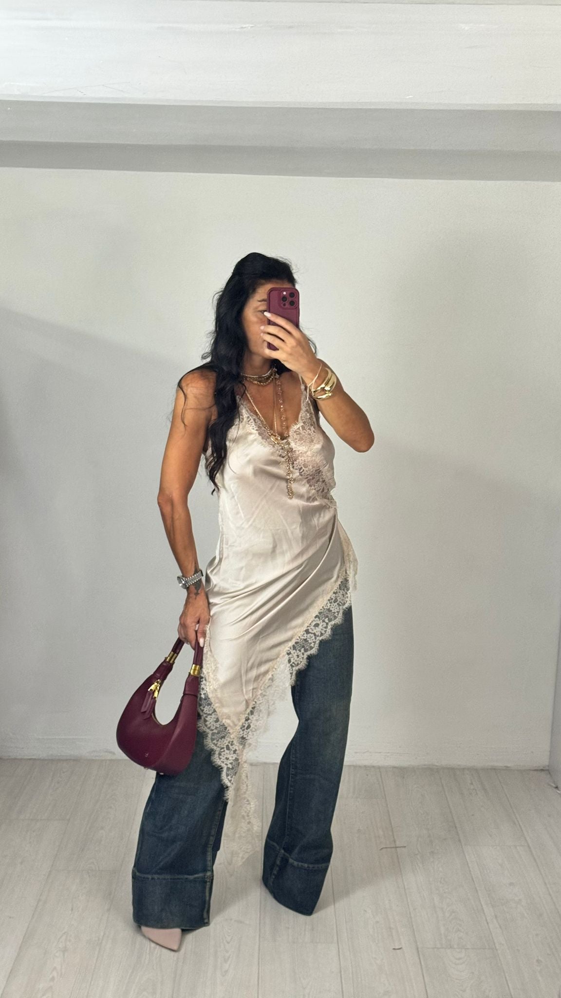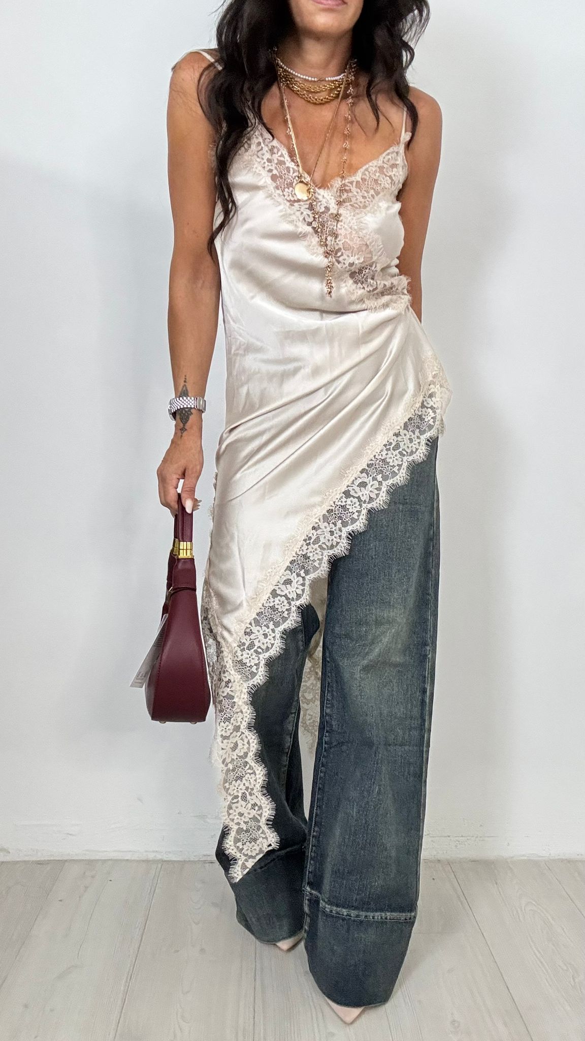 con inserti in pizzo , asimettrico , con spallina sottile