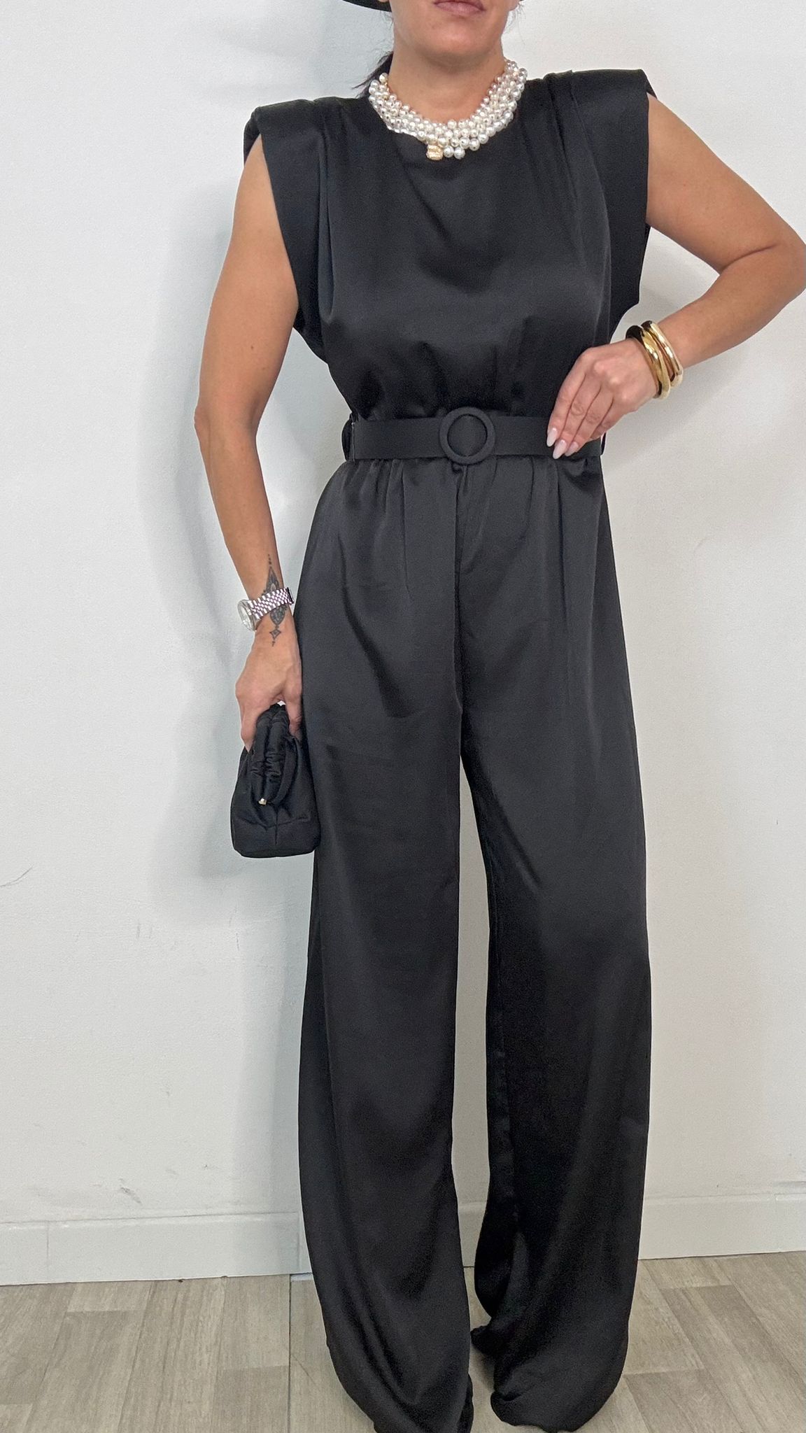 jumpsuit , girocollo con spallina strutturata, smanicata ,gamba larga , cintura stesso colore effetto raso, elastico in vita