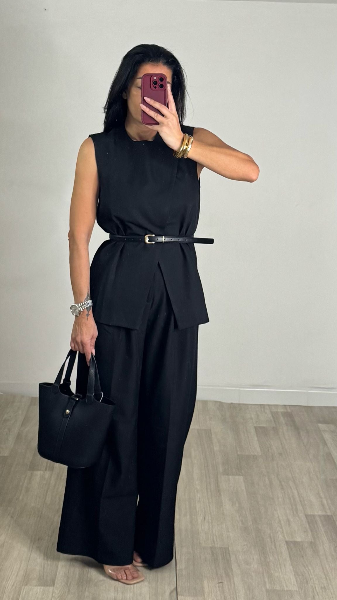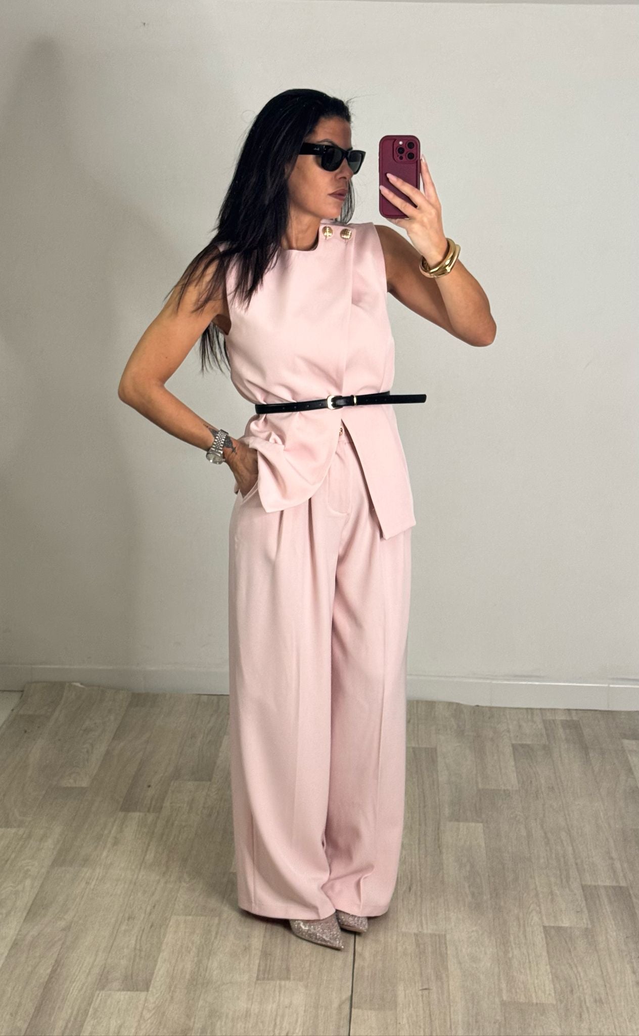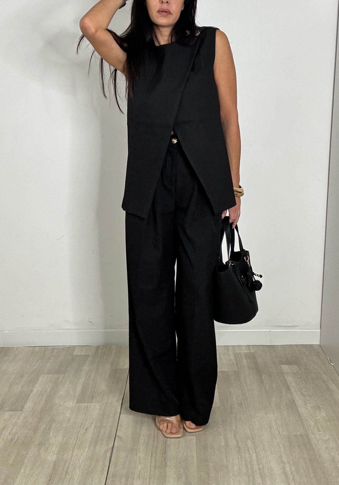COMPLETO TAILLEUR , GILET + PANTALONE , GILET ASIMMETRICO CON 2 BOTTONI ORO SULLA SPALLA