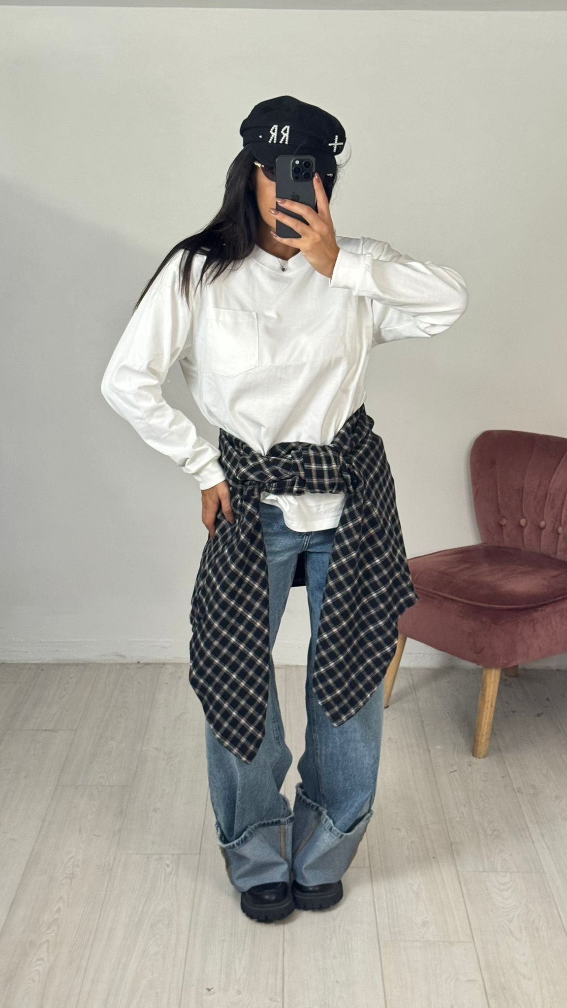 Enza è alta 1.65, regolarmente indossa taglia S , la camicia si presenta in taglia unica veste fino ad 46 ITA