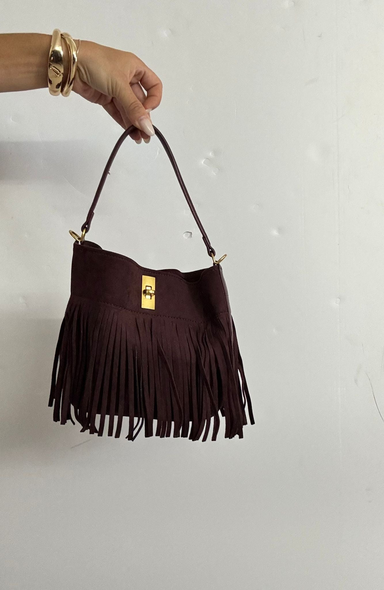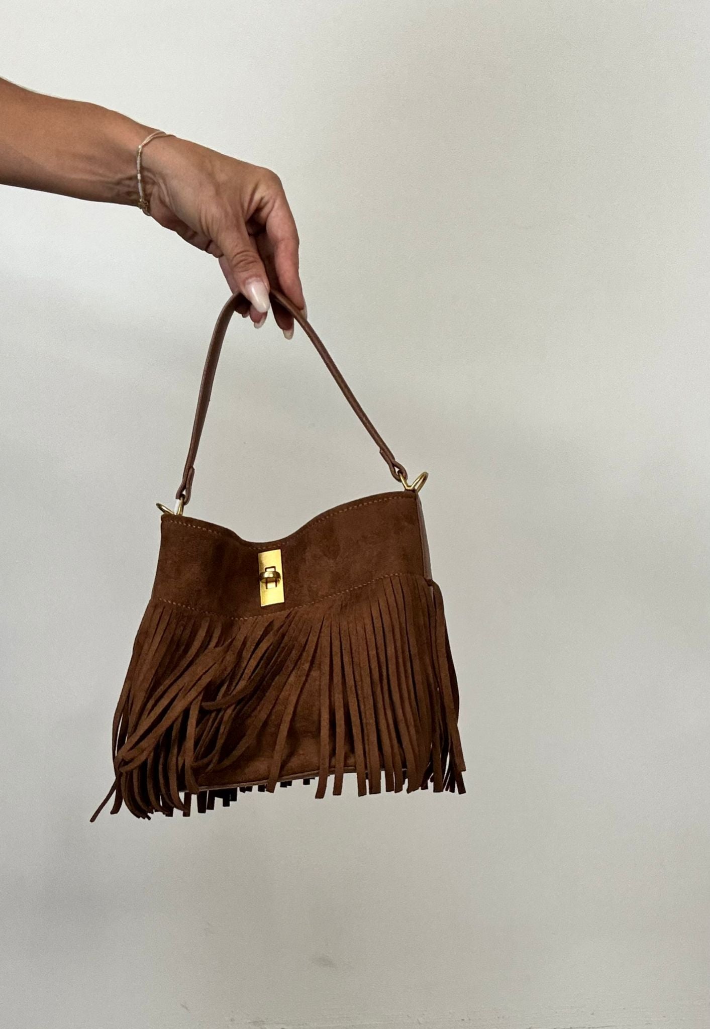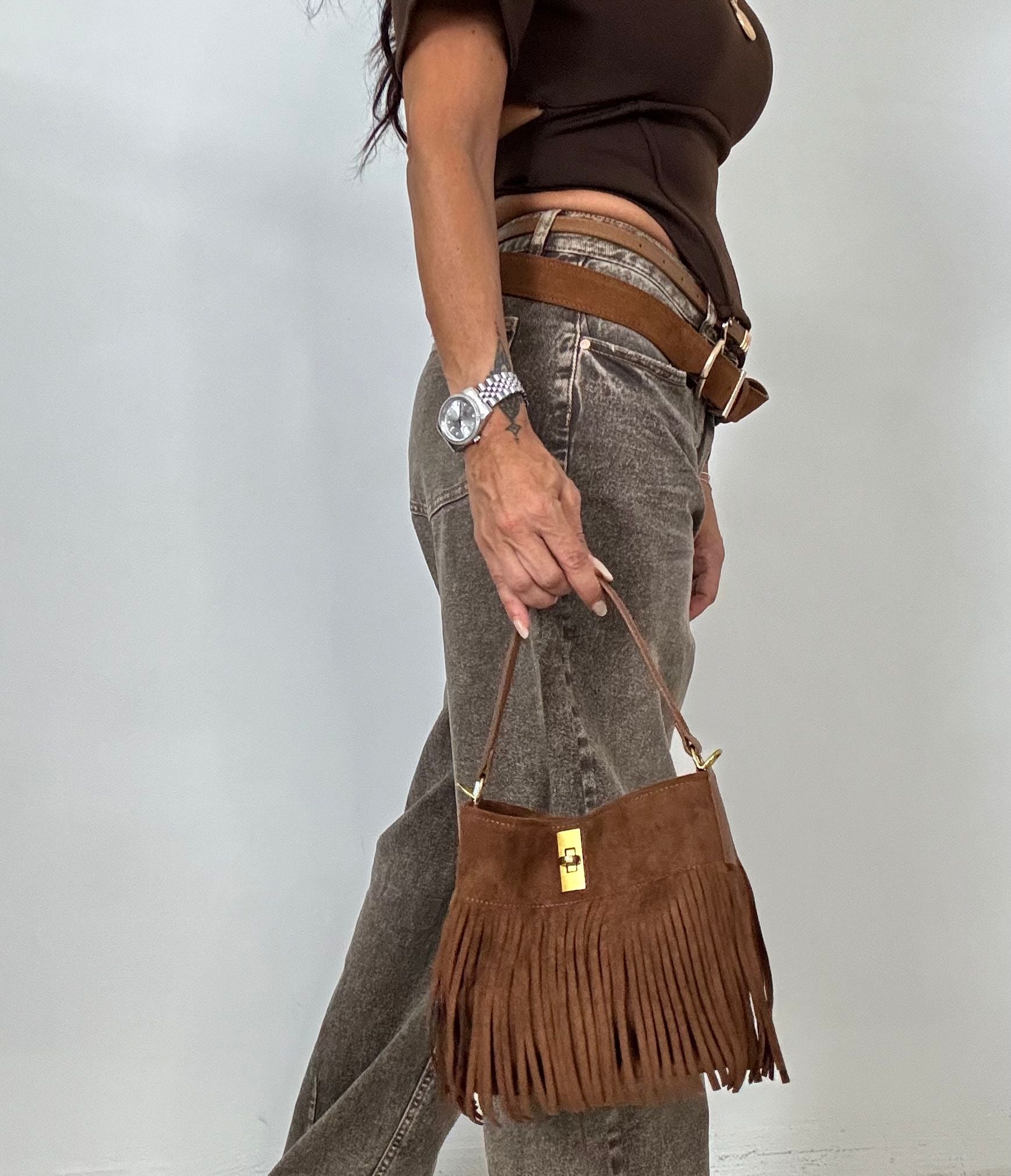in dainetto , con frange chiusura con zip tracolla a spalla