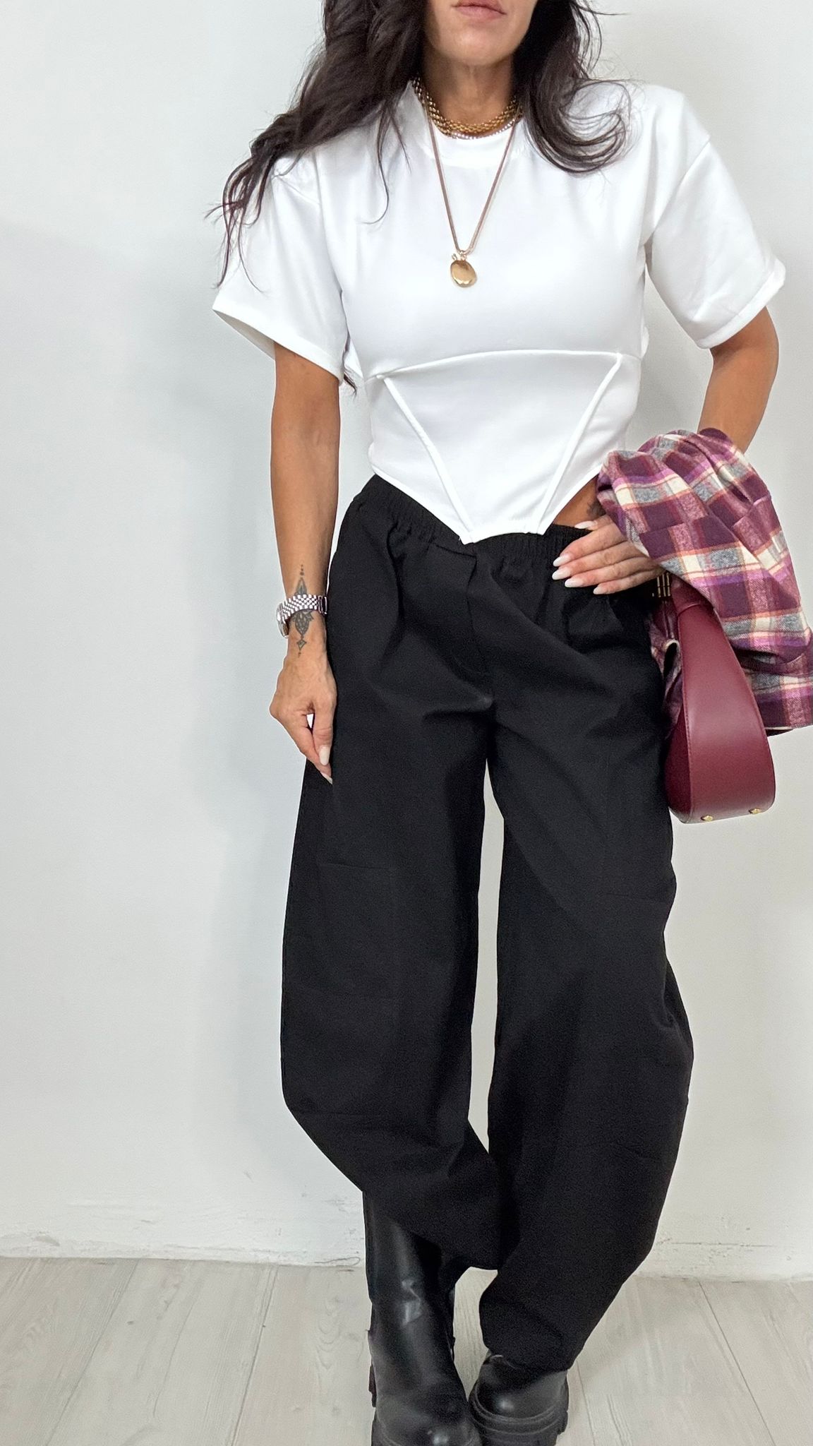 Enza è alta 1.65, regolarmente indossa taglia S il pantalone si presenta in taglia unica , veste fino ad una 46